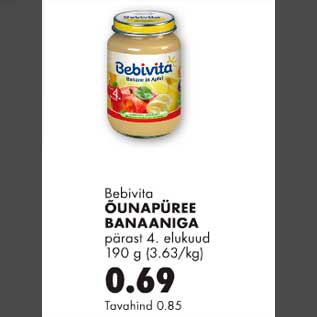 Период кампании: 03.05.2012 - 04.06.2012 Цена: 0.69€ Яблочное пюре банановое после 4 месяцевÕunapüree banaaniga pärast 4.elukuud 190g