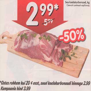 Период кампании: 18.07.2012 - 22.07.2012 Цена: 2.99€ Свиной шейный карбонадПри покупке на 20е,Вы купите свиной шейный карбонад по2,99. Компания - цена 3,99 Sea kaelakarbonaad, kg Ostes rohkem kui 20e ttst,saad kaelakarbonadi hinnaga 2,99 Kompaania hind 3,99