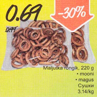 Период кампании: 23.07.2012 - 29.07.2012 Цена: 0.69€ СушкиMaljutka rõngik, 220 g *mooni *magus