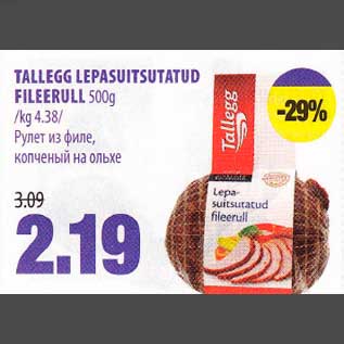 Период кампании: 05.09.2012 - 17.09.2012 Цена: 2.19€ Рулет из филе, копченый на ольхеTALLEGG LEPASUITSUTATUD FILEERULL 500g