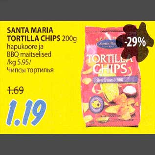 Период кампании: 03.10.2012 - 15.10.2012 Цена: 1.19€ Чипсы тортильяSANTA MARIA TORTILLA CHIPS 200g hapukoore ja BBQ maitselised