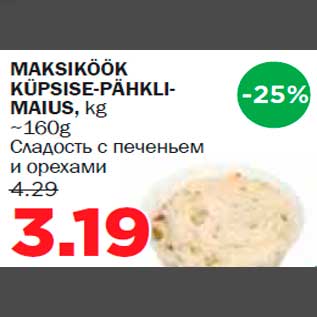 Период кампании: 17.10.2012 - 13.11.2012 Цена: 3.19€ Сладость с печеньем и орехамиMAKSIKÖÖK KÜPSISE-PÄHKLIMAIUS, kg ~160g