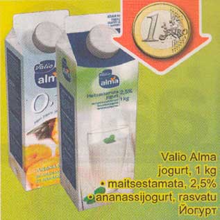 Период кампании: 12.11.2012 - 18.11.2012 Цена: 1.00€ ЙогуртValio Аlmа jogurt, 1 kg .maitsestamata, 2,5%