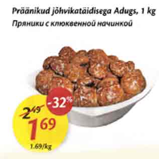 Период кампании: 18.12.2012 - 26.12.2012 Цена: 1.69€ Пряники с клюквенной начuнкойРräänikud jõhvikatäidisega Adugs, 1 kg