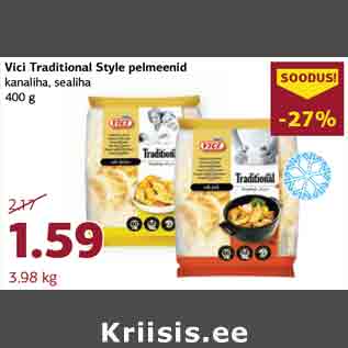 Период кампании: 07.03.2013 - 17.03.2013 Цена: 1.59€ Пельмени Vici курица, свинина 400 гVici Traditional Style pelmeenid