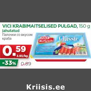 Период кампании: 13.03.2013 - 25.03.2013 Цена: 0.59€ Палочки со вкусом крабаVICI KRABIMAITSELISED PULGAD, 150 g