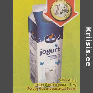 Период кампании: 24.06.2013 - 30.06.2013 Цена: 1.00€ Йогурт без вкусовых добавок1 kg Valio Alma maitsestamata jogurt