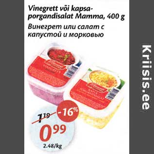 Период кампании: 25.06.2013 - 01.07.2013 Цена: 0.99€ Винегрет или салат с капустой и морковью400 g Vinegrett või kapsaporgandisalat Mamma,
