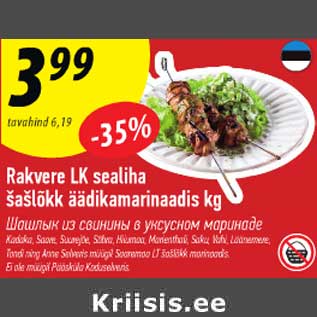 Не продаётся Pääsküla Kaduselveris Rakvere LK sealiha šašlõkk äädikamarinaadis kg Kadaka,Saare, Suuejõe, Sõbra, Hiiumaa, Marienthali, Saku, Vahi, Läänemere, Tondi ning Anne Selveris müügil Saaremaa LT šašlõkk marinaadis