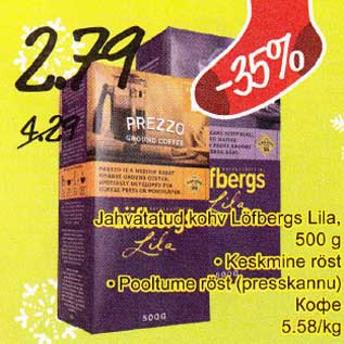 Период кампании: 02.12.2013 - 08.12.2013 Цена: 2.79€ Кофе.Keskmine röst .Pooltume röst (presskannu) Jahvatatud Löfbergs Lila, 500 g