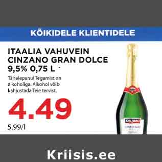 Продукт игристое вино cinzano gran dolce 9,5% 0,75 л италия продавался со скидкой в магазине Maksimarket, Konsum в период с 19.12.2013 по 22.12.2013 по цене 4.49 евро.