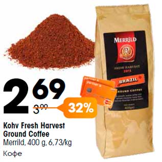 Период кампании: 30.01.2014 - 04.02.2014 Цена: 2.69€ КофеMerrild, 400 g, 6,73/kg Kohv Fresh Harvest
