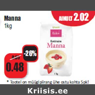 Период кампании: 02.02.2014 Цена: 0.48€ Манная крупа 1кг*Товар ограничен для покупки в одну корзину 5 пк! Manna