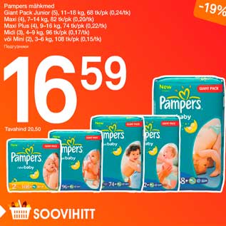 Период кампании: 05.02.2014 - 16.02.2014 Цена: 16.59€ ПодгузникиGiant Pack Junior(5), 11-18kg, 68 tk/pk (0,24/tk) Maxi (4), 7-14 kg, 82 tk/pk (0,20/tk) Maxi Plus (4), 9-16 kg, 74 tk/pk (0,22/tk) Midi (3), 4-9 kg 96 tk/pk (0,17/tk) või Mini (2), 3-6 kg, 108 tk/pk (0,15/tk) Pampers mähcmed