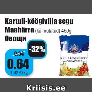 Период кампании: 17.02.2014 - 23.02.2014 Цена: 0.64€ Овощи(külmutatud) 450g Kartuli-köögivilja segu