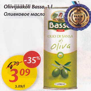 Период кампании: 01.05.2014 - 05.05.2014 Цена: 3.09€ Оливковое маслоOliivijääkõli Basso, 1 l