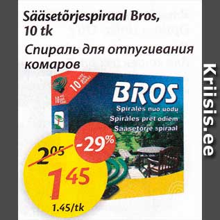 Период кампании: 22.07.2014 - 28.07.2014 Цена: 1.45€ Спираль для отпугивания комаровSääsetõrjespiraal Bros, 10 tk
