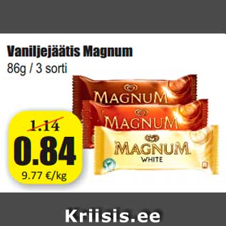 Период кампании: 01.08.2014 - 07.08.2014 Цена: 0.84€ Ванильное мороженое86g / 3 sorti Vaniljejäätis Magnum