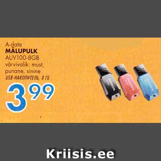 Период кампании: 06.10.2014 - 12.10.2014 Цена: 3.99€ USB-НАКОПИТЕЛЬ 8 ГБvärvivalk: must, punane, sinine A-data MÄLUPULK AUV100-8GB