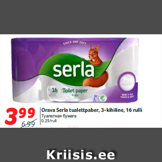 Период кампании: 25.11.2014 - 01.12.2014 Цена: 3.99€ Туалетная бумагаOrava Serla tualettpaber, 3-kihiline, 16 rulli