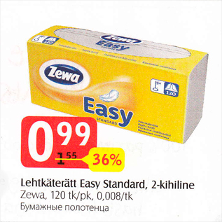 Период кампании: 03.02.2015 - 02.03.2015 Цена: 0.99€ Бумажные полотенцаZewa, 120 tk/pk Lehträtikud Easy Standard, 2-kihiline