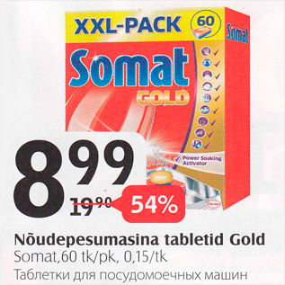 Период кампании: 24.02.2015 - 02.03.2015 Цена: 8.99€ Таблетки для посудомоечных машинSomat, 60 tk/pk Nõudepesumasina tabletid Gold