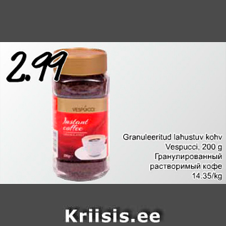 Период кампании: 06.04.2015 - 12.04.2015 Цена: 2.99€ Гранулированный растворимый кофеGranuleeritud laghustuv kohv Vespucci, 200 g