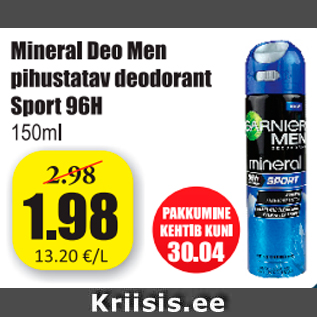 Период кампании: 10.04.2015 - 30.04.2015 Цена: 1.98€ Дезодорант150 ml Mineral Deo Men pihustatav deodorant Sport 96H