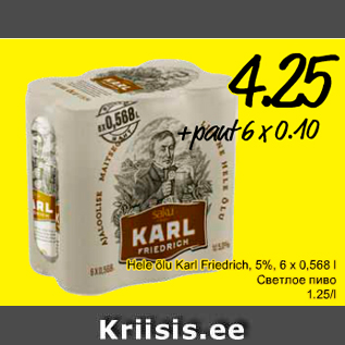Период кампании: 23.04.2015 - 26.04.2015 Цена: 4.25€ Светлое пивоHele õlu Karl Friedrich, 5%, 6x0,568 l Kriisis.ee не несёт ответственности за содержание комментариев. Мнение автора комментария может отличаться от мнения kriisis.ee. По возможности, отслеживая комментарии, kriisis.ee оставляет за собой право удалять их без объяснения причин. Если вы заметили неуместный комментарий, пожалуйста сообщите нам о нём.