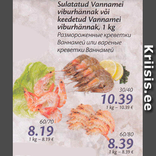 Период кампании: 23.04.2015 - 27.04.2015 Цена: 8.19€ Размороженные креветки Ваннамей или вареные креветки ВаннамейSulatatud Vannamei viburhännak või keedetud Vannamei viburhännak, 1 kg