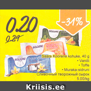 Период кампании: 27.04.2015 - 03.05.2015 Цена: 0.20€ Сливочный творожный сырок.Vanilli .Toffe .Muraka-sidruni Saare Koorene kohuke, 40 g