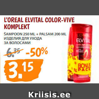 Период кампании: 01.07.2015 - 14.07.2015 Цена: 3.15€ ИЗДЕЛИЯ ДЛЯ УХОДА ЗА ВОЛОСАМИŠAMPOON 250 ML + PALSAM 200 ML L’OREAL ELVITAL COLOR-VIVE