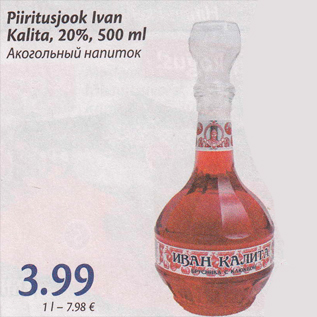 Период кампании: 02.07.2015 - 06.07.2015 Цена: 3.99€ Алкогольный напиток20%, 500 ml Piirutusjook Ivan Kalita Kriisis.ee не несёт ответственности за содержание комментариев. Мнение автора комментария может отличаться от мнения kriisis.ee. По возможности, отслеживая комментарии, kriisis.ee оставляет за собой право удалять их без объяснения причин. Если вы заметили неуместный комментарий, пожалуйста сообщите нам о нём.