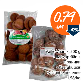 Период кампании: 20.07.2015 - 26.07.2015 Цена: 0.79€ Пряники, Овсяное печенье.Rahvapräänik .Kaeraküpsis Väike Väänik, 500 g