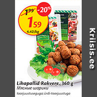 Период кампании: 06.10.2015 - 12.10.2015 Цена: 1.59€ Мясные шарикиtoorjuustuseguga; ürdi-toorjuustuga Lihapallid Rakvere, 360 g