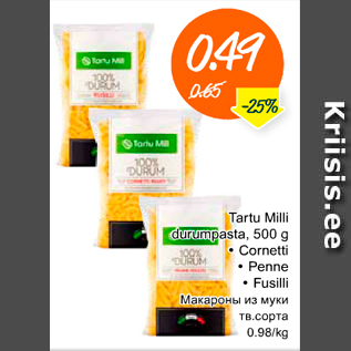 Период кампании: 02.11.2015 - 08.11.2015 Цена: 0.49€ Макароны из муки тв. сорта.Cornetti .Penne .Fusilli tartu Milli durumpasta, 500 g