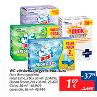 Товар гель для туалета продавался со скидкой в магазине Maxima в период с 12.01.2016 по 18.01.2016 по цене 1.69 евро.