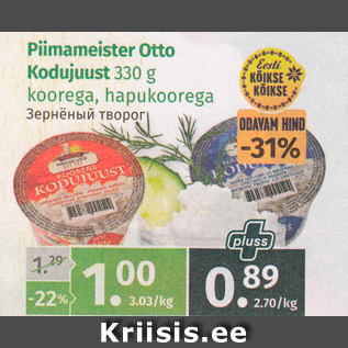 Период кампании: 16.03.2016 - 05.04.2016 Цена: 0.89€ Зерненый творогkoorega, hapukoorega Piimameister Otto Kodujuust 330 g