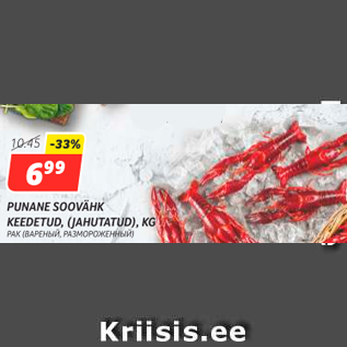 Период кампании: 19.04.2016 - 25.04.2016 Цена: 6.99€ РАК (ВАРЕННЫЙ, РАЗМОРОЖЕННЫЙ)PUNANE SOOVÄHK KEEDETUD, (JAHUTATUD), KG