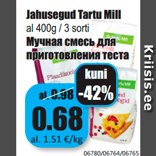 Период кампании: 08.05.2016 - 15.05.2016 Цена: 0.68€ Мучная смесь для приготовления тестаal 400g / 3 so Jahusegud Tartu Mill