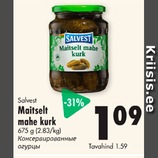 Период кампании: 13.06.2016 - 26.06.2016 Цена: 1.09€ Консервированные огурцыSalvest Maitselt mahe kurk 675 g