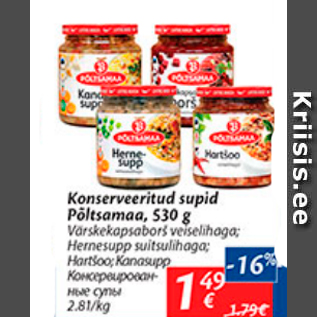Период кампании: 13.09.2016 - 19.09.2016 Цена: 1.49€ Консервированные супыVärskekapsaborš veiselihaga; Hernesupp suitsulihaga; Hartšoo; Kannasupp Konserveritud supid Põltsamaa, 530 g