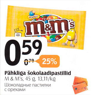 Период кампании: 27.09.2016 - 03.10.2016 Цена: 0.59€ Шоколадные пастилки с орехамиM & M´s, 45 g Pähkliga šokolaadipastillid