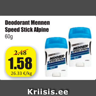 Период кампании: 07.10.2016 - 20.10.2016 Цена: 1.58€ ДезодорантDeodorant Mennen Speed Stick Alpine 60 g
