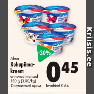 Период кампании: 27.10.2016 - 30.11.2016 Цена: 0.45€ Творожный кремerinevad maitsed 150 g Alma Kohupiimakreem
