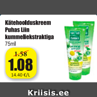 Период кампании: 18.11.2016 - 01.12.2016 Цена: 1.08€ Крем для рук Чистая линия с экстрактом ромашкиKatehoolduskreem Puhas Liin kummeliekstraktiga 75 ml