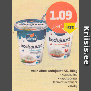 Период кампании: 06.02.2017 - 12.02.2017 Цена: 1.09€ Зерненый творог.Klassikaline .Hapukoorega Valio Alma kodujuust, 5%, 380 g