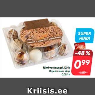 Период кампании: 14.02.2017 - 20.02.2017 Цена: 0.99€ Перепелиные яйца(кроме Vanalinna, Viru и Tornimäe Rimis) Rimi vutimunad, 12 tk (v.a Vanalinna, Viru ja Tornimäe Rimis)