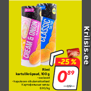 Продукт картофельные чипсы продавался со скидкой в магазине Hüper Rimi, Rimi в период с 04.04.2017 по 10.04.2017 по цене 0.89 евро.