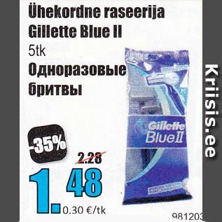 Период кампании: 16.04.2017 - 22.04.2017 Цена: 1.48€ Одноразовые бритвыÜhekordne raseerija Gillette Blue II 5 tk